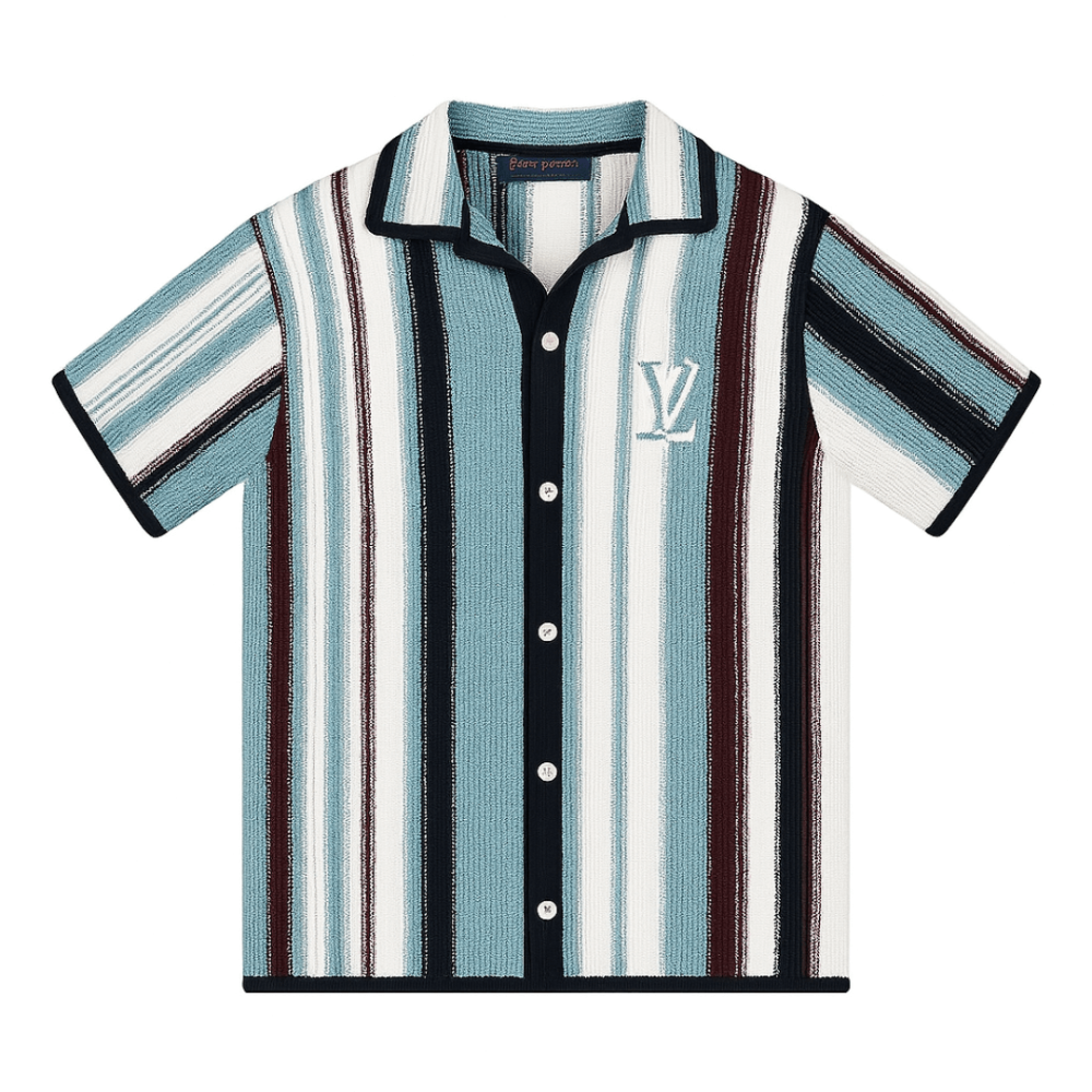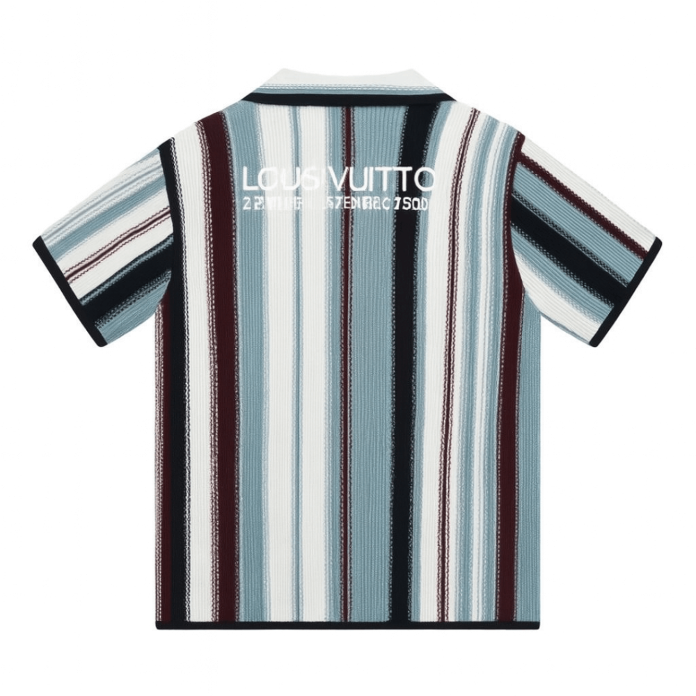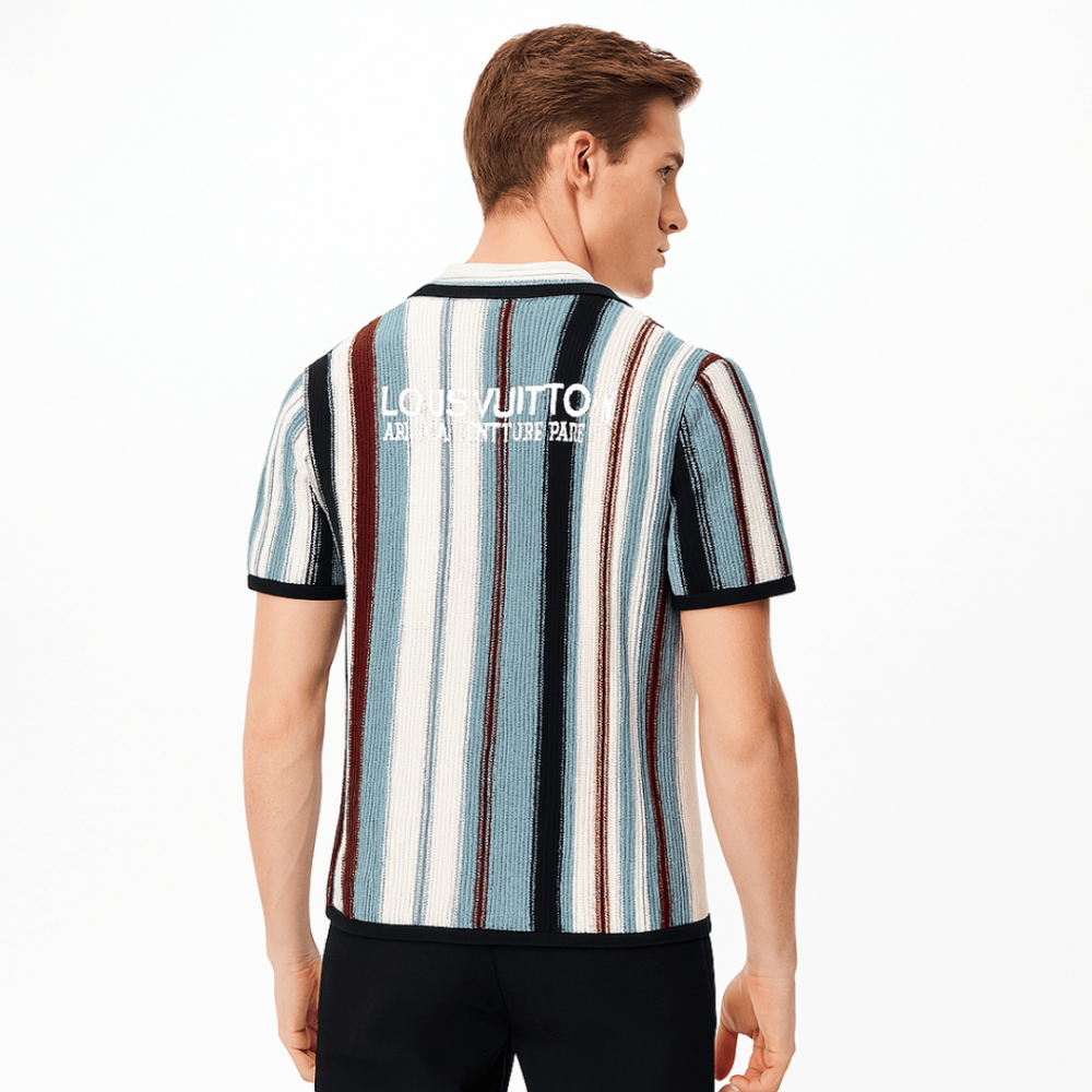 قميص رجالي أنيق بخطوط عمودية بألوان متداخلة مميزة، يجمع بين الكلاسيكية والجرأة في تصميم واحد. خامة ناعمة ومريحة، وتفاصيل دقيقة مثل الياقة المضلّلة وشعار LV تضيف لمسة فاخرة.