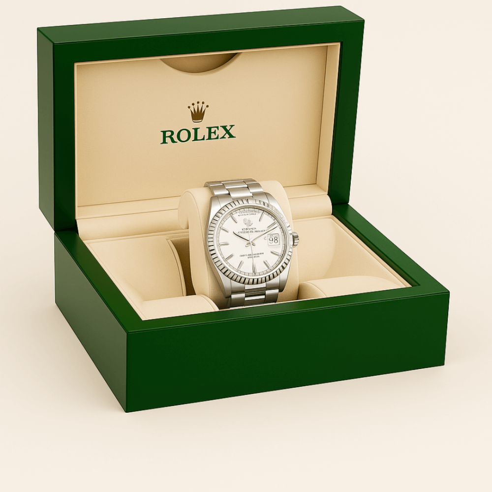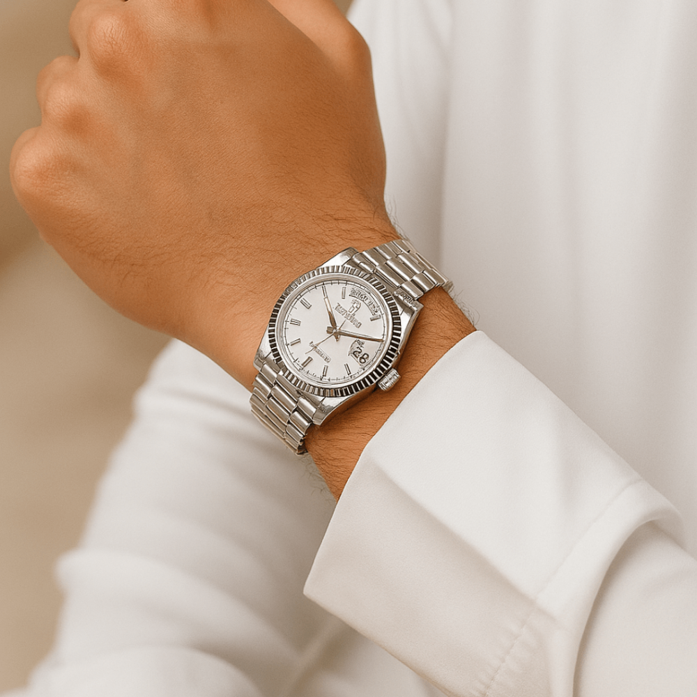 ساعة بتصميم ملكي أنيق يجمع بين الفخامة والكلاسيكية. تأتي بقرص أبيض ناصع داخل هيكل فضي لامع، مع سوار معدني مصقول يعكس النور بثقة. مثالية للرجل العصري الباحث عن الرقي والبساطة في آنٍ واحد.